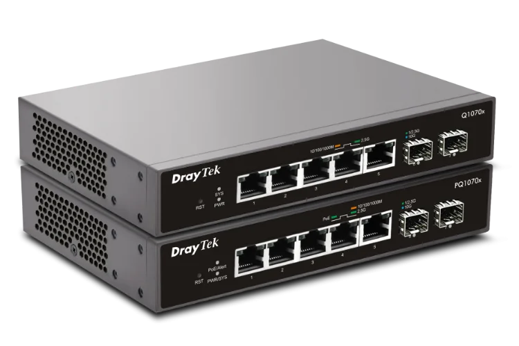 Seznamte se s nejnovější generací přepínačů – VigorSwitch Q1070x a VigorSwitch PQ1070x (s podporou PoE). Tyto výkonné 2.5GbE přepínače se dvěma 10G SFP+ uplink porty dokážou využít maximum z WiFi 6 a moderních sítí.