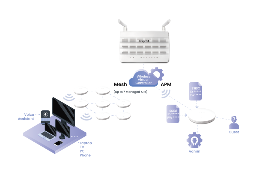 Vigor2136ax je nový router s operačním systémem DrayOS 5, který podporuje virtuální kontrolér a integruje protokoly Vigor Mesh i AP Management. To umožňuje simultánní správu více přístupových bodů připojených ke stejné síti prostřednictvím kabelového nebo bezdrátového připojení (s povolenou technologií Mesh). Počet kompatibilních spravovaných přístupových bodů (AP) je určen seznamem zařízení Virtual Controller: jeden kořenový AP (samotné zařízení) a až sedm bezdrátově připojených AP. Celkový počet uzlů Vigor2136ax spravovatelných pomocí APM zůstává stejný jako maximálně 20 uzlů, bez ohledu na to, zda jsou kabelové nebo bezdrátové.