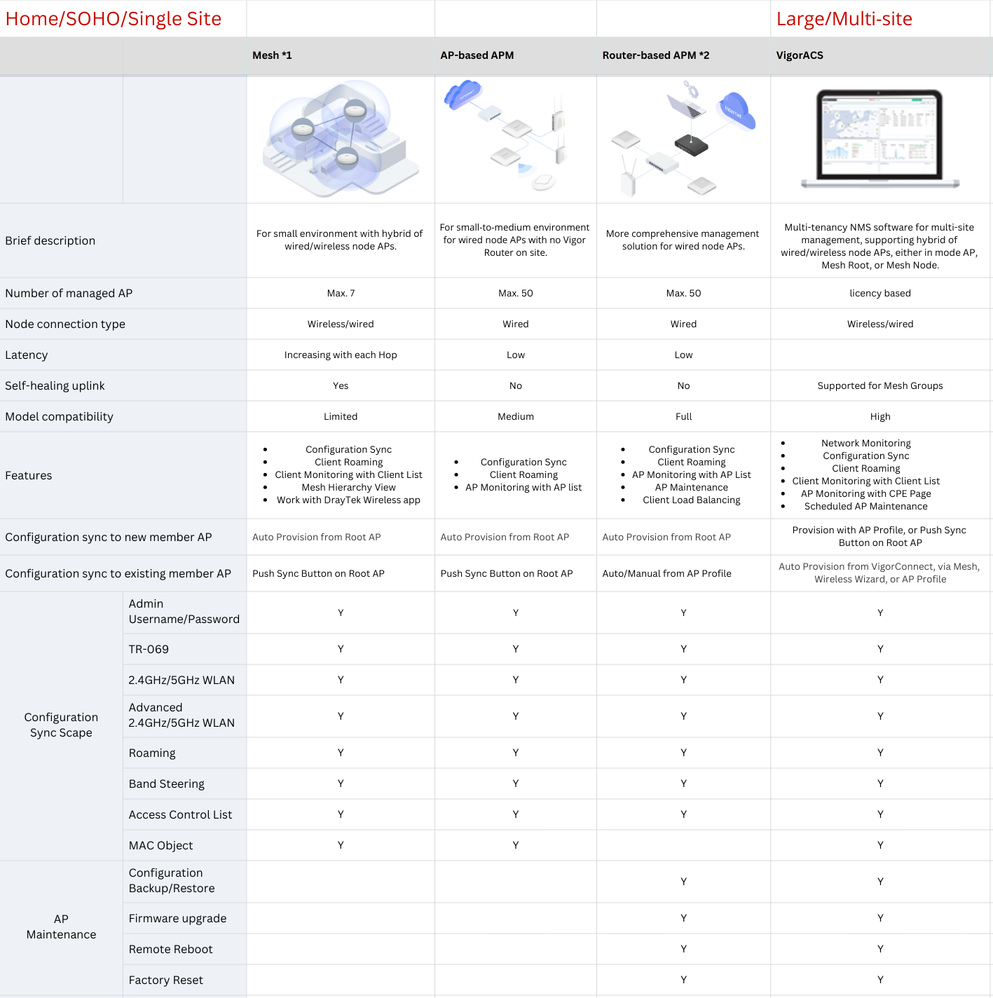 Od domácností/SOHO s jen několika přístupovými body, přes středně velké kanceláře s desítkami přístupových bodů až po velké podniky s více pobočkami, DrayTek nabízí různá řešení správy přístupových bodů navržená tak, aby zjednodušila každý scénář.