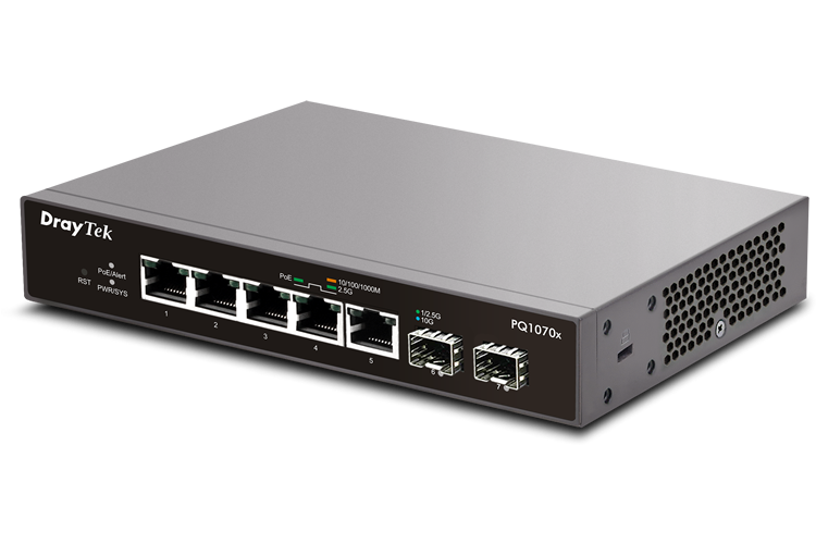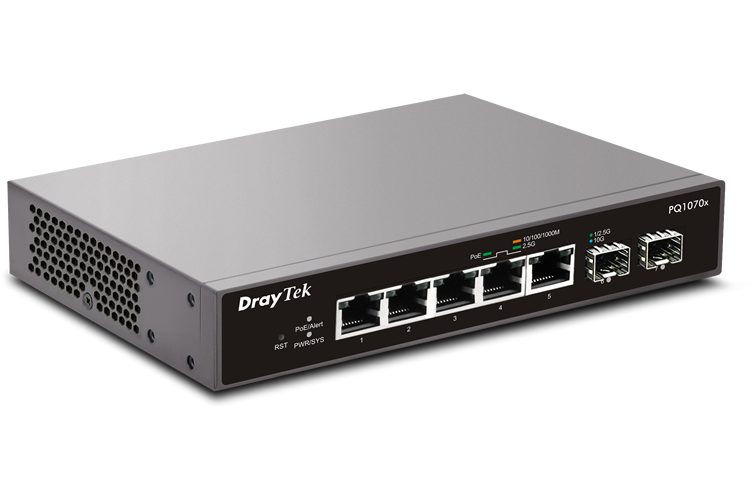 VigorSwitch PQ1070x je 2,5 gigabitový přepínač Smart Lite s 10G SFP+ uplinky, ideální pro plné využití výkonu WiFi 6. Díky 5 portům PoE+ (30 W na port, celkem 75 W) tento přepínač snadno podporuje aplikace IoT, jako je LED osvětlení, pokladní systémy a senzory. Tento model je vybaven uživatelským rozhraním WUI a díky funkcím, jako jsou VLAN, řízení bouří, QoS a detekce smyček, nabízí PQ1070x stabilní, bezpečnou a efektivní síť. Hledáte model bez PoE? Pak se podívejte na VigorSwitch Q1070x.