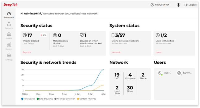 DrayTek kombinuje silné zabezpečení se snadným používáním. Kombinace zabezpečení na úrovni brány s cloudovou inteligencí v reálném čase vytváří inteligentní ochrannou vrstvu, která se neustále učí a přizpůsobuje novým hrozbám.