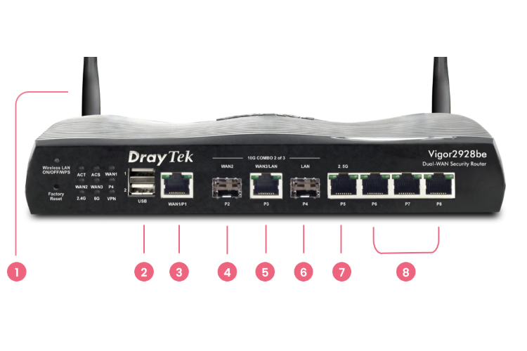 Zařízení Vigor 2928be je vybaveno rozhraním Wi-Fi 7 (802.11be) a nabízí pokročilé technologie, jako je Multi Link Operation (MLO) a Multiple Resource Units (MRU) pro maximální výkon a efektivitu.