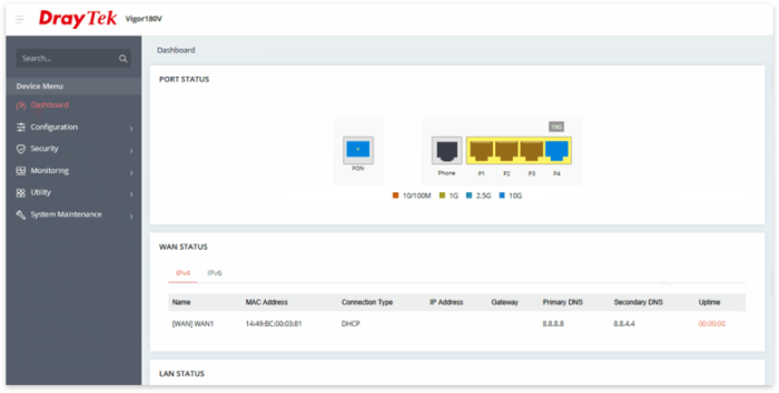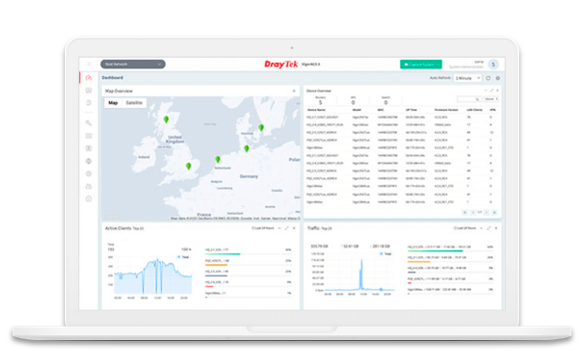 Vigor 180 se systémem DrayOS 5 má uživatelsky přívětivé rozhraní, které umožňuje snadnou správu sítě. Díky přehledu o stavu sítě v reálném čase máte vždy kontrolu nad výkonem a připojenými zařízeními.