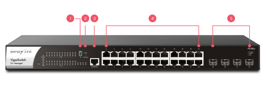 VigorSwitch P2282x je pokročilý řízený PoE přepínač vrstvy 2+ se čtyřmi 10gigabitovými uplink porty a 24 gigabitovými porty PoE+. Tyto porty uplink jsou ideální pro síťová připojení mezi přepínači, servery a úložnými zařízeními a zajišťují efektivní a rychlý přenos dat.