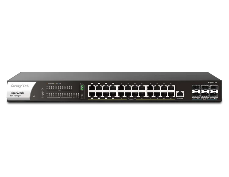 VigorSwitch PQ2300xb je spravovaný přepínač 2+ 2,5G vrstvy se šesti porty SFP+ (10G) uplink a 24 porty 2,5G, včetně 8 portů PoE++ s výkonem až 90 W na port a 16 portů PoE+.10gigabitové porty uplink lze použít pro síťové uplinky mezi přepínači, servery a úložnými zařízeními. Při použití s přístupovými body Vigor WiFi 6 (např. VigorAP 962C) poskytuje PQ2300xb klientům LAN plný výkon WiFi 6.